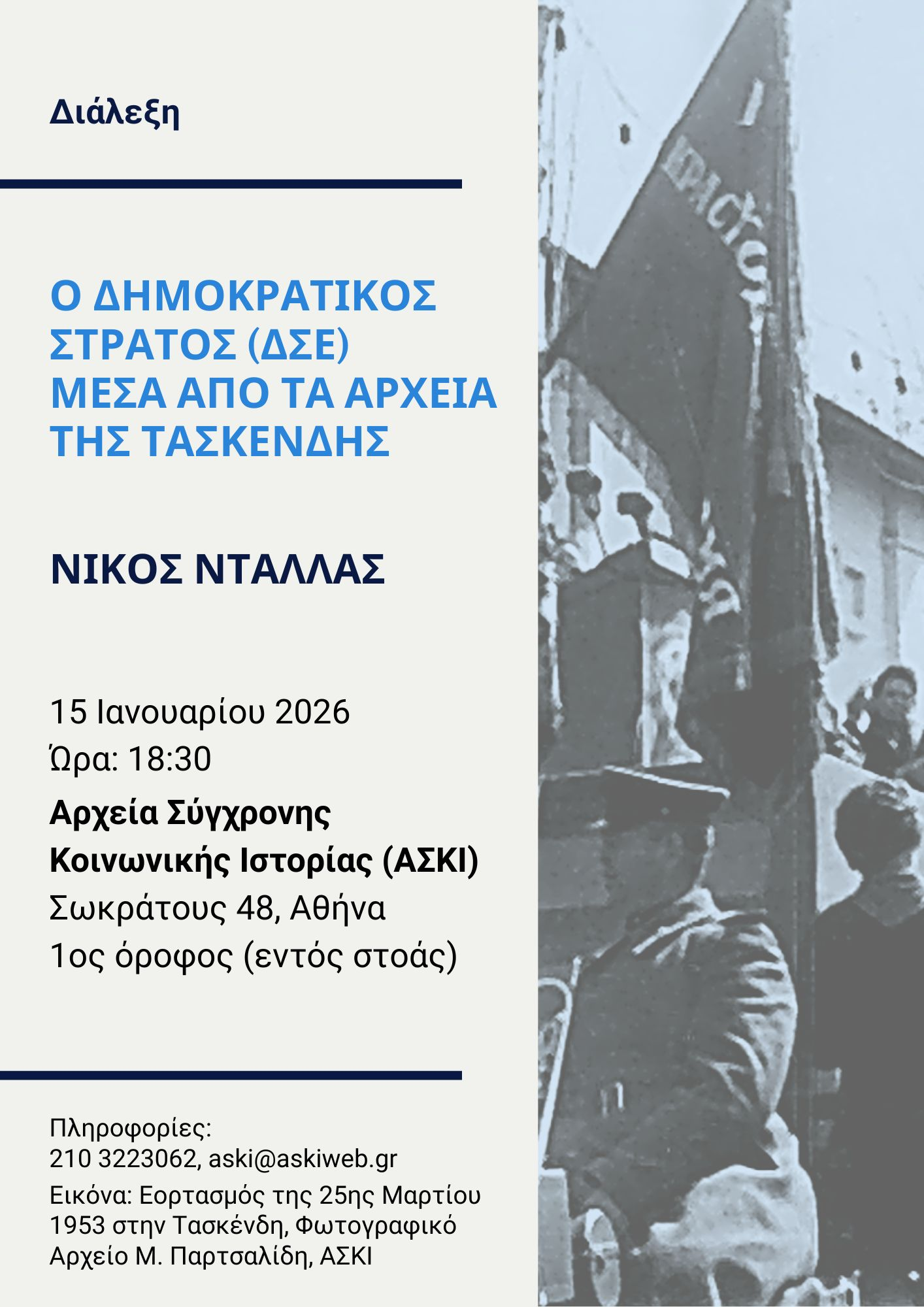 Διάλεξη του Νίκου Ντάλλα με θέμα: “Ο Δημοκρατικός Στρατός (ΔΣΕ) μέσα από τα αρχεία της Τασκένδης” διοργανώνουν τα Αρχεία Σύγχρονης Κοινωνικής Ιστορίας, την Πέμπτη 15 Ιανουαρίου 2026, στις 18:30, στην οδό Σωκράτους 48, Αθήνα, 1ος όροφος (εντός στοάς).