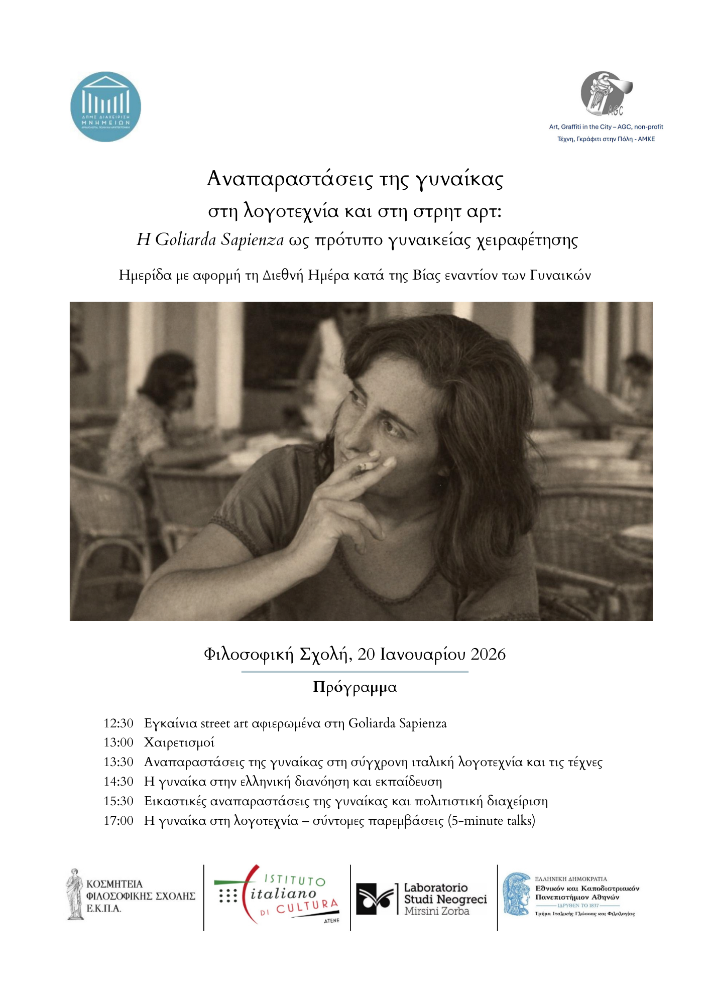Η Διεύθυνση Διαχείρισης Μνημείων, Αρχαιολογικών και Ιστορικών Χώρων και η ΑΜΚΕ Art, Graffiti in the City – AGC, με αφορμή τη Διεθνή Ημέρα για την Εξάλειψη της Βίας κατά των Γυναικών, σε συνεργασία με την Κοσμητεία της Φιλοσοφικής Σχολής του Εθνικού και Καποδιστριακού Πανεπιστημίου Αθηνών, το Ιταλικό Μορφωτικό Ινστιτούτο Αθηνών, το Εργαστήριο Νεοελληνικών Σπουδών «Μυρσίνη Ζορμπά» και το Τμήμα Ιταλικής Γλώσσας και Φιλολογίας του Εθνικού και Καποδιστριακού Πανεπιστημίου Αθηνών, διοργανώνουν ημερίδα με τίτλο “Αναπαραστάσεις της γυναίκας στη λογοτεχνία και στη στρητ αρτ Η Goliarda Sapienza ως πρότυπο γυναικείας χειραφέτησης” την Τρίτη 20 Ιανουαρίου 2026, 12:30-19:00 στη Φιλοσοφική Σχολή – ΕΚΠΑ, με ελεύθερη είσοδο.