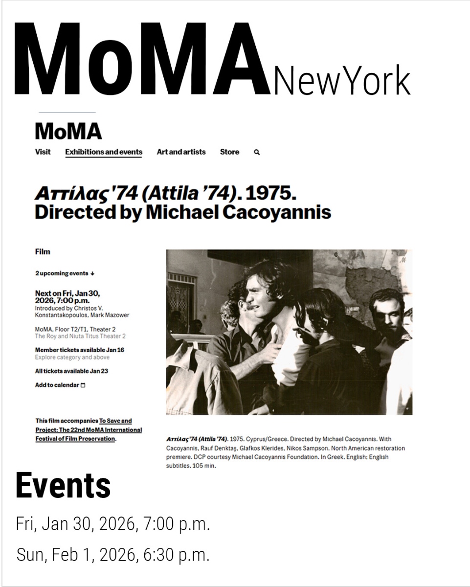 Το «Αττίλας ’74» («Attila ’74»), το ντοκιμαντέρ του 1975 σε σκηνοθεσία του θρυλικού κινηματογραφιστή Μιχάλη Κακογιάννη, θα προβληθεί την Παρασκευή 30 Ιανουαρίου, στις 7 μ.μ., στο Μουσείο Μοντέρνας Τέχνης (MoMA) της Νέας Υόρκης. Πρόκειται για την πρεμιέρα της αποκατεστημένης εκδοχής της ταινίας στη Βόρεια Αμερική και την προβολή θα προλογίσουν ο παραγωγός Χρήστος Β. Κωνσταντακόπουλος και ο καθηγητής Μαρκ Μαζάουερ, συγγραφέας του βιβλίου «The Greek Revolution: 1821 and the Making of Modern Europe».