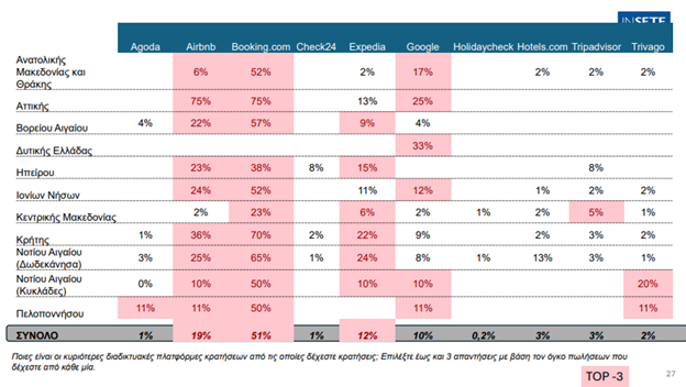 Οι διαδικτυακές πλατφόρμες αποτελούν το κυρίαρχο κανάλι κρατήσεων και συγκεκριμένα η Booking.com κυριαρχεί ως η κορυφαία πλατφόρμα κρατήσεων σε εθνικό επίπεδο με 51% μερίδιο, παρουσιάζοντας ιδιαίτερα υψηλή διείσδυση στην Αττική (75%), την Κρήτη (70%), τα Δωδεκάνησα (65%), το Βόρειο Αιγαίο (57%), την Ανατολική Μακεδονία & Θράκη (52%), τα Ιόνια Νησιά (52%), τις Κυκλάδες (50%) και την Πελοπόννησο (50%). Ακολουθεί η Airbnb ως δεύτερη δύναμη με 19% εθνικά, με εντυπωσιακά ποσοστά στην Αττική (75%), την Κρήτη (36%), τα Δωδεκάνησα (25%), τα Ιόνια Νησιά (24%), την Ήπειρο (23%) και το Βόρειο Αιγαίο (22%). Η Expedia έρχεται τρίτη με 12% συνολικά, ξεχωρίζοντας στα Δωδεκάνησα (24%), την Κρήτη (22%), την Ήπειρο (15%) και την Αττική (13%).