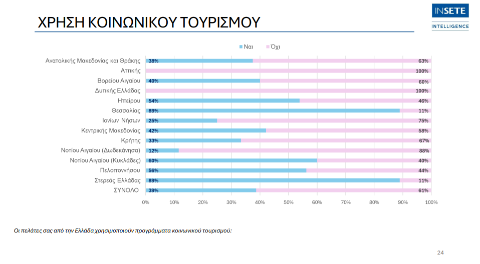 Αντίθετα, μηδενική χρήση καταγράφεται στη Δυτική Ελλάδα και την Αττική, στοιχείο που δείχνει ότι, στις συγκεκριμένες Περιφέρειες, οι εγχώριοι πελάτες δεν αξιοποιούν τα προγράμματα κοινωνικού τουρισμού. Η εικόνα αυτή έχει ιδιαίτερη σημασία, καθώς ο κλάδος των ενοικιαζόμενων δωματίων παραμένει κατά βάση μικρής κλίμακας και εποχικός, με το 64% των επιχειρήσεων να απασχολεί 1-2 εργαζόμενους και το 87% να λειτουργεί εποχικά.
