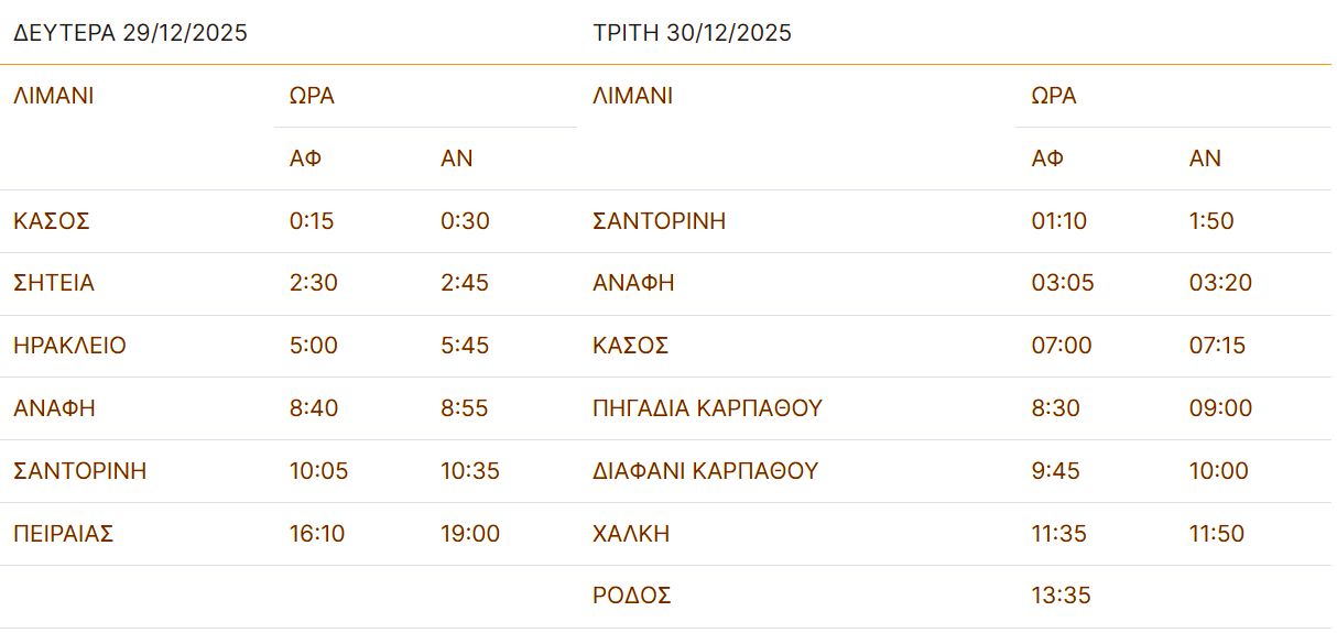 ΤΡΙΤΗ 30/12/25: Το πλοίο θα αναχωρήσει από Πειραιά στις 21:00 (αντί 15:00) για Πάτμο 04:45-05:00, Λειψούς 05:30-05:40, Αγία Μαρίνα Λέρου 06:10-06:25, Κάλυμνο 07:25-07:45, Κω 08:30-08:50, Σύμη 11:00-11:15, Ρόδο 12:20 και κατόπιν ως εγκεκριμένα.