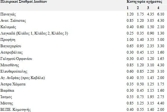 Οι νέες τιμές διοδίων διαμορφώνονται ως εξής: