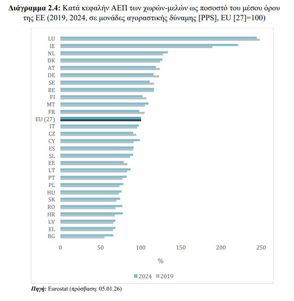 Το κατά κεφαλήν ΑΕΠ της Ελλάδας σε μονάδες αγοραστικής δύναμης (PPS) ανήλθε από 65,5% του μέσου όρου της ΕΕ το 2019 σε 68,5% το 2024. Παράλληλα, σε σύγκριση με τις χώρες της Ανατολικής Ευρώπης, η Ελλάδα υπολείπεται χωρών όπως η Τσεχία (90,6%), η Λιθουανία (87,5%), η Εσθονία (79,0%) και η Πολωνία (78,4%), ενώ συγκρίνεται κυρίως με τη Λετονία (68,4%). Η Ρουμανία (77%) είναι σαφώς σε υψηλότερη θέση από την Ελλάδα, η οποία υπερβαίνει μόνο τη Βουλγαρία (65,9%). Αξίζει να σημειωθεί ότι την περίοδο 2019-2024 η Ελλάδα βελτίωσε τη θέση της κατά μόλις 3 ποσοστιαίες μονάδες, έναντι 11 ποσοστιαίων μονάδων της Βουλγαρίας, γεγονός που καταδεικνύει ασθενέστερη δυναμική σύγκλισης.