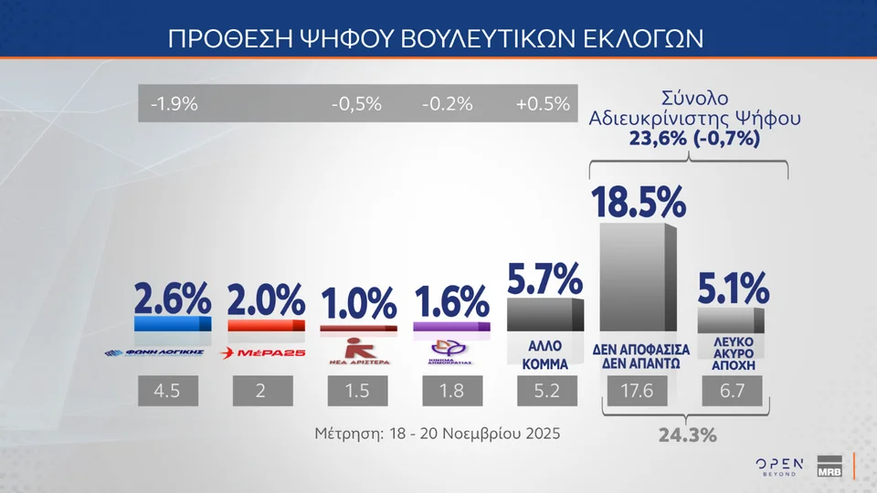 Eνδιαφέροντα ευρήματα καταγράφονται στην τελευταία δημοσκόπηση της MRB για λογαριασμό του OPEN.
