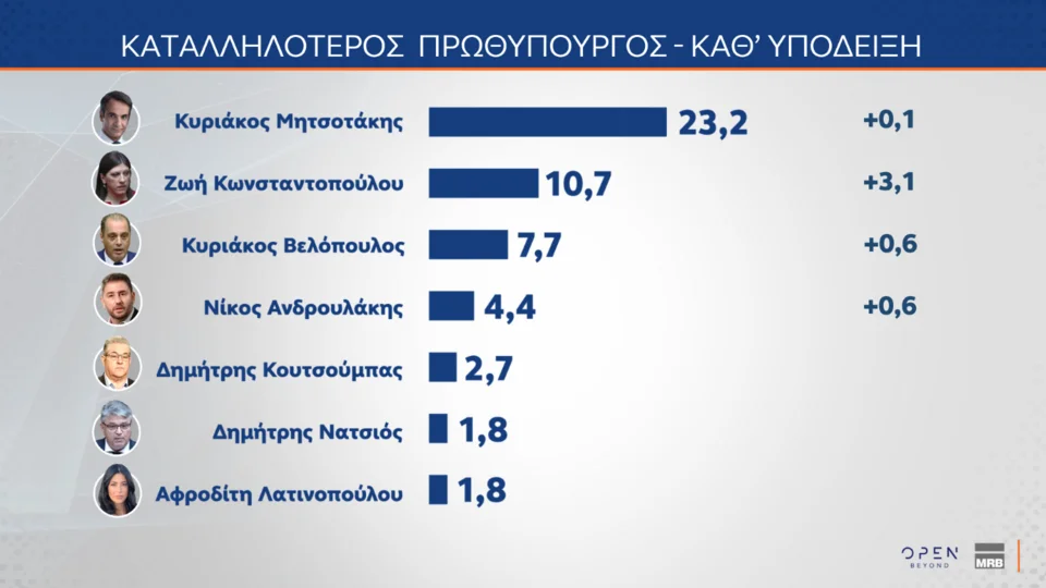 Σε ερώτημα για τον καταλληλότερο πρωθυπουργό, ο Κυριάκος Μητσοτάκης βρίσκεται στο 23,2%, με τη Ζωή Κωνσταντοπούλου να ακολουθεί με 10,7%. Τρίτος είναι ο Κυριάκος Βελόπουλος με 7,7%, ενώ ο Νίκος Ανδρουλάκης είναι τέταρτος με 4,4%.