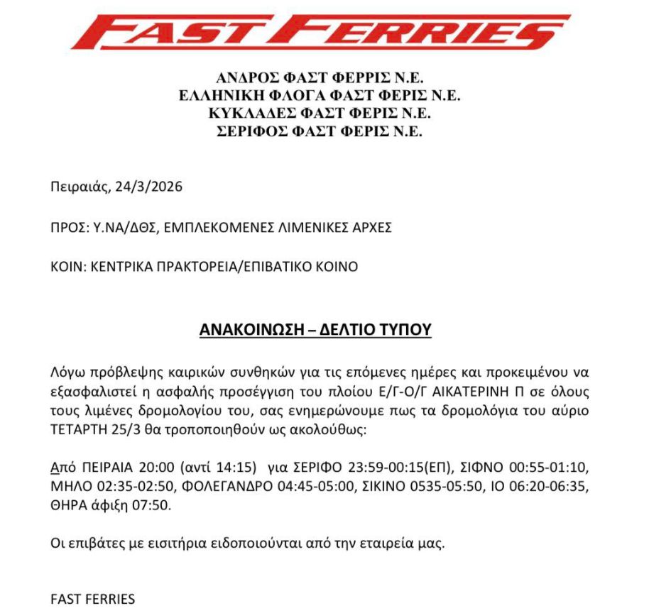 Από ΠΕΙΡΑΙΑ 20:00 (αντί 14:15) για ΣΕΡΙΦΟ 23:59-00:15(ΕΠ), ΣΙΦΝΟ 00:55-01:10, ΜΗΛΟ 02:35-02:50, ΦΟΛΕΓΑΝΔΡΟ 04:45-05:00, ΣΙΚΙΝΟ 0535-05:50, ΙΟ 06:20-06:35, ΘΗΡΑ άφιξη 07:50.