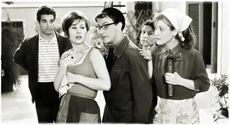 Μαζί με τους Κώστα Πρέκα, Ελένη Προκοπίου, Ντίνο Ηλιόπουλο και Κατερίνα Γιουλάκη στην ταινία “Οι Κυρίες της Αυλής”.