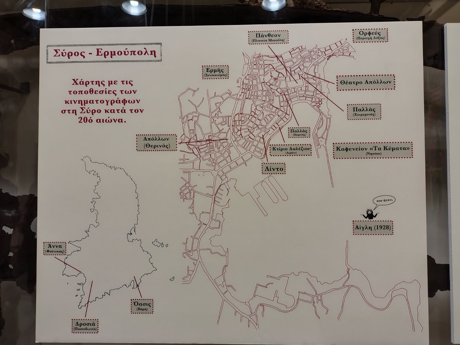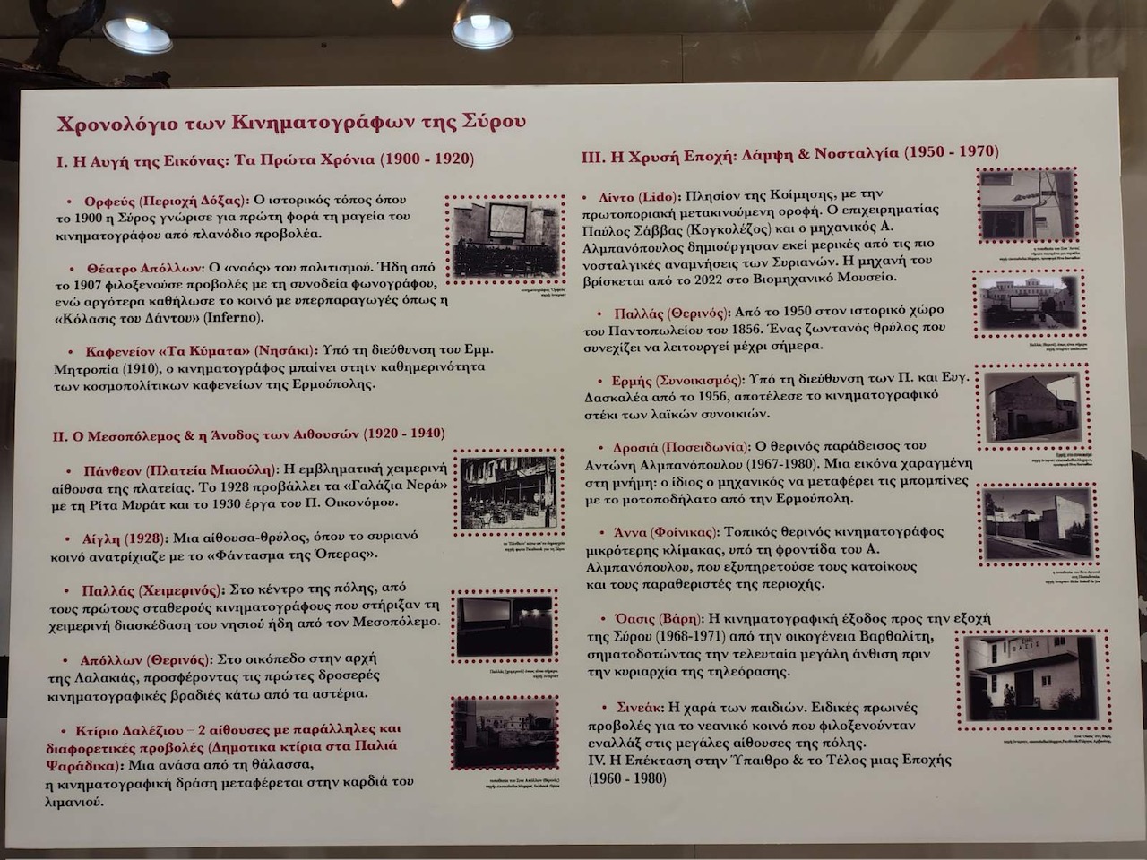 Η έκθεση αναδεικνύει την πολύτιμη συμβολή της Σύρου στην ανάπτυξη του κινηματογράφου στην Ελλάδα. Από τις αρχές του 20ού αιώνα, η Ερμούπολη υπήρξε πρωτοπόρος, φιλοξενώντας μερικές από τις πρώτες και πιο εμβληματικές κινηματογραφικές αίθουσες της χώρας, αποτελώντας ένα διαχρονικό κέντρο πολιτιστικής ακτινοβολίας για όλο το Αιγαίο.