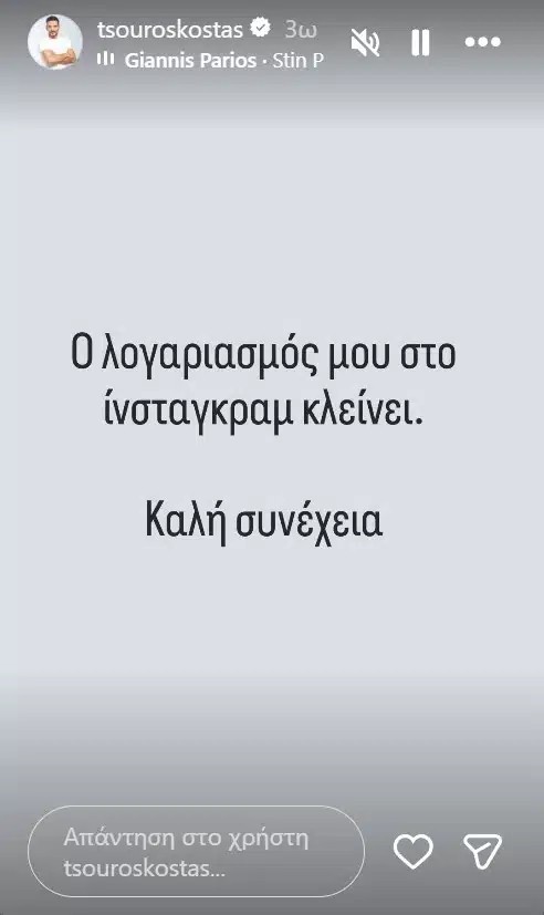 Με ένα story που ανέβηκε σε μαύρο φόντο, ο Κώστας Τσουρός έγραψε χαρακτηριστικά: «Ο λογαριασμός μου στο Instagram κλείνει. Καλή συνέχεια».