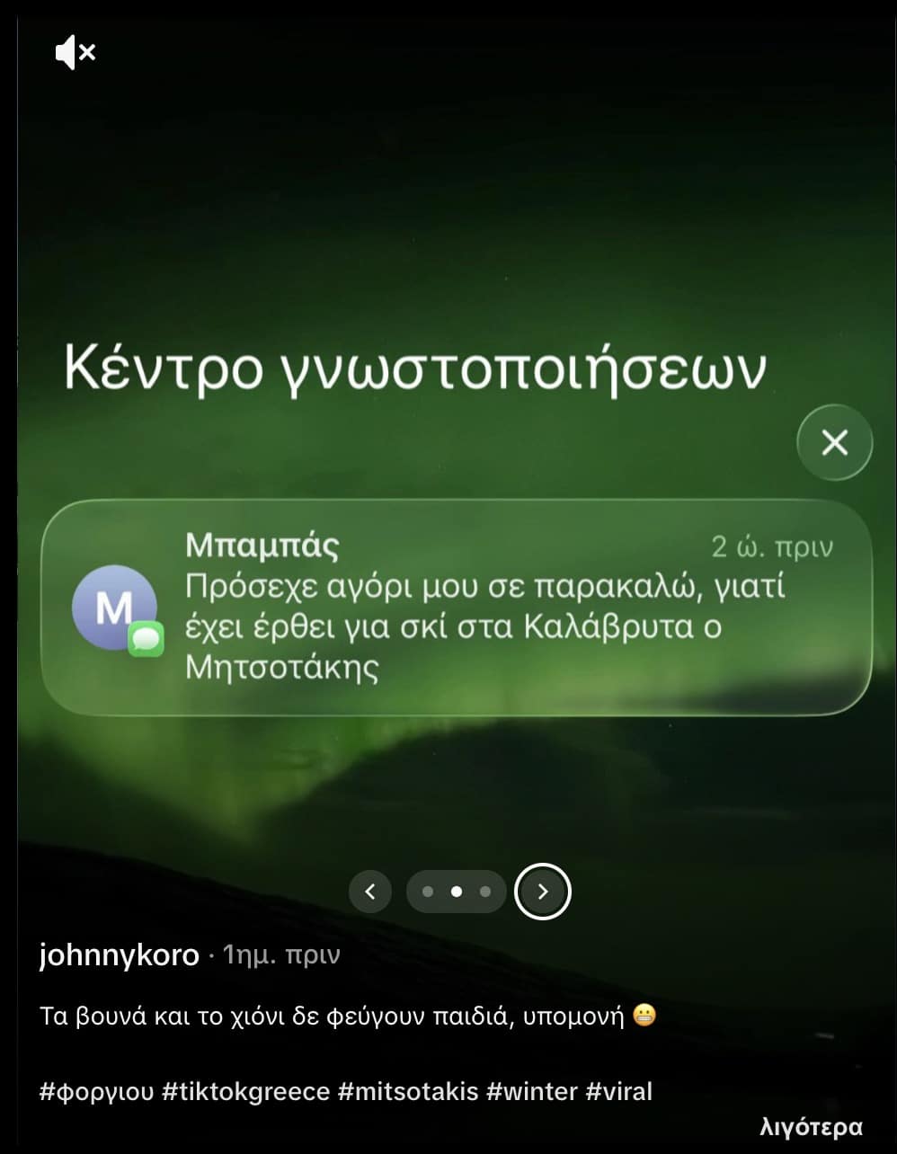 Ένας νεαρός σκιέρ, με όνομα χρήστη στο TikTok johnnykoro, ανέβασε δύο φωτογραφίες από την εξόρμησή του στο βουνό, συνοδευόμενες από ένα screenshot μηνύματος του πατέρα του, που τον προειδοποιούσε να προσέχει επειδή «έχει έρθει για σκι στα Καλάβρυτα ο Μητσοτάκης».
