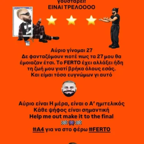 «Έχει περάσει σχεδόν ένας μήνας από την κυκλοφορία του “Ferto” και ακόμη δεν μπορώ να πιστέψω το πόσο το έχετε αγκαλιάσει, χορέψει, γουστάρει. “Είναι τρελό”. Αύριο γίνομαι 27. Δεν φανταζόμουν ποτέ πως τα 27 μου θα έμοιαζαν έτσι. Το “Ferto” έχει αλλάξει ήδη τη ζωή μου, γιατί βρήκα όλους εσάς. Και είμαι τόσο ευγνώμων γι’ αυτό», έγραψε ο τραγουδιστής στο story του. Στο ίδιο μήνυμα, ο Akylas υπενθύμισε ότι η ημέρα του Ημιτελικού είναι ιδιαίτερα σημαντική, απευθύνοντας κάλεσμα στο κοινό να τον στηρίξει ώστε να προκριθεί στον τελικό: «Αύριο είναι η μέρα, είναι ο Α’ ημιτελικός. Κάθε ψήφος είναι σημαντική. Βοηθήστε με το να πάμε στον τελικό. #A4 για να στο φέρω #FERTO», σημείωσε ο Akylas.