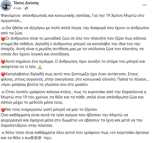 Στο κείμενο του που δημοσιεύτηκε στον προσωπικό του λογαριασμό στο facebook ο δημοσιογράφος τα βάζει με ένα κομμάτι της κοινωνίας που έχει την άποψή πως για ό,τι συνέβη στην Κεφαλονιά φταίει η Μυρτώ.