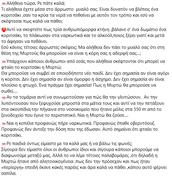 Σίγουρα δεν είμαστε όλοι οι άνθρωποι ίδιοι και σίγουρα κάποιοι μπορούμε να διαφωνούμε μεταξύ μας. Αλλά το να λέμε τέτοιες παλαβομάρες ,ότι δηλαδή η Μυρτώ ήτανε από αλητοοικογένεια ,πως δεν την πρόσεχαν και πως ήταν «περίεργη» επειδή έκανε κακές παρέες και άρα καλά να πάθει ,κάπου αυτό φέρνει σαπίλα.