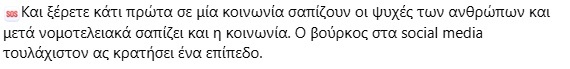 Και ξέρετε κάτι πρώτα σε μία κοινωνία σαπίζουν οι ψυχές των ανθρώπων και μετά νομοτελειακά σαπίζει και η κοινωνία. Ο βούρκος στα social media τουλάχιστον ας κρατήσει ένα επίπεδο.