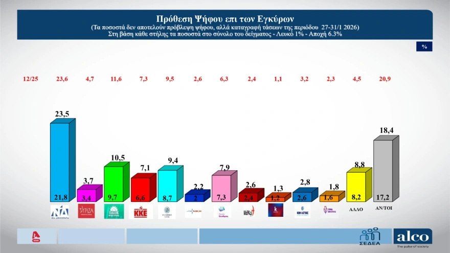 Σύμφωνα με την έρευνα που παρουσιάστηκε στο κεντρικό δελτίο του Alpha, η Νέα Δημοκρατία παραμένει πρώτη στην πρόθεση ψήφου επί των εγκύρων, με ποσοστό 23,5%, ενώ ακολουθεί το ΠΑΣΟΚ με 10,5%. Η ALCO καταγράφει – όπως και όλες οι υπόλοιπες δημοσκοπήσεις του Ιανουαρίου – άνοδο για την Πλεύση Ελευθερίας από το 6,3% στο 7,9% , ωστόσο στην τρίτη θέση με 9,4% εμφανίζεται η Ελληνική Λύση.