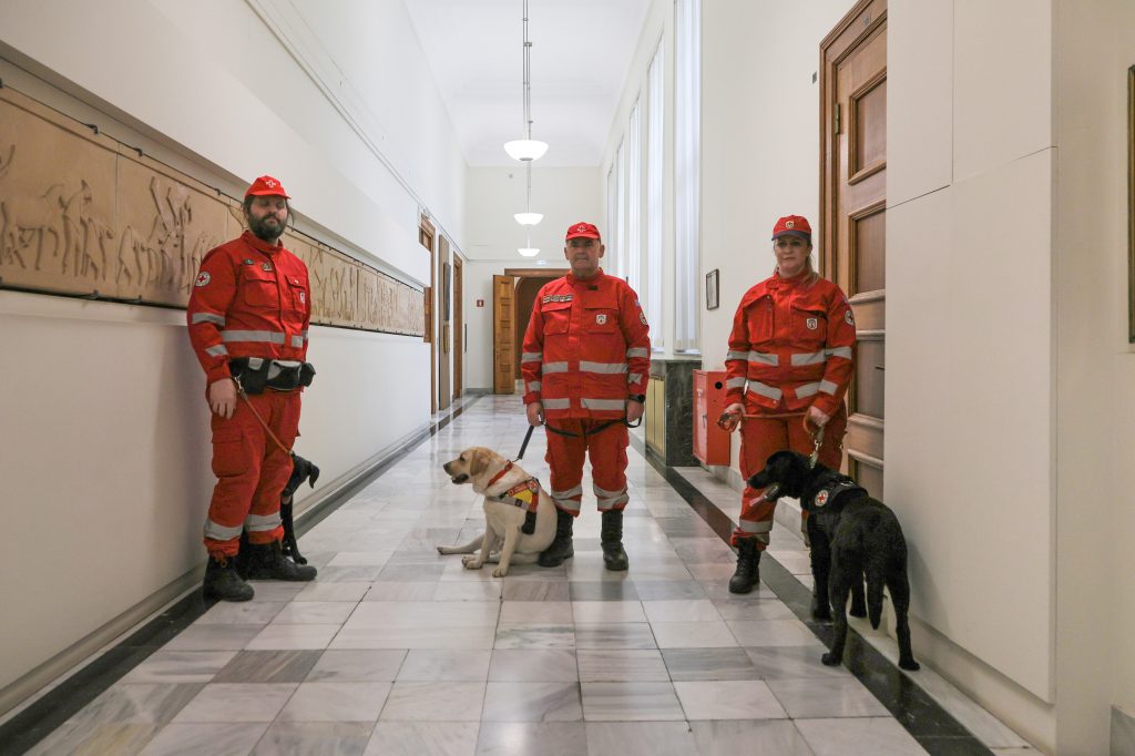 Όπως σημειώνεται σε σχετική ανακοίνωση, τα δύο από τα τρία σκυλιά-διασώστες που ήρθαν στη Βουλή, ο King και η Kira, είναι αυτά που δώρισε η Βουλή για την ενίσχυση της Κυνοφιλικής Ομάδας Έρευνας και Διάσωσης (Κ9) του Ελληνικού Ερυθρού Σταυρού. Η εκπαίδευση των σκύλων αυτών έχει ήδη ξεκινήσει και περιλαμβάνει την ανίχνευση ανθρώπινου οσμικού ίχνους, την υπακοή, τον προσανατολισμό και την εργασία υπό πίεση, ώστε να τεθούν άμεσα στην κρίσιμη αυτή υπηρεσία. Ο τρίτος σκύλος-διασώστης, η Ήρα, που ήρθε στη Βουλή, συμμετείχε πρόσφατα στις έρευνες εντοπισμού αγνοουμένου στο Αίγιο.