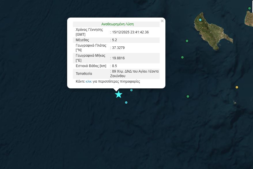 Σεισμός μεγέθους 5,2 βαθμών της κλίμακας Ρίχτερ σημειώθηκε 20 λεπτά πριν τις 2 τα ξημερώματα της Τρίτης στα ανοιχτά της Ζακύνθου.