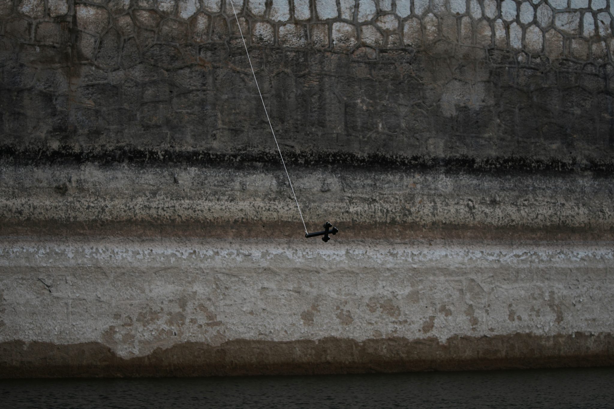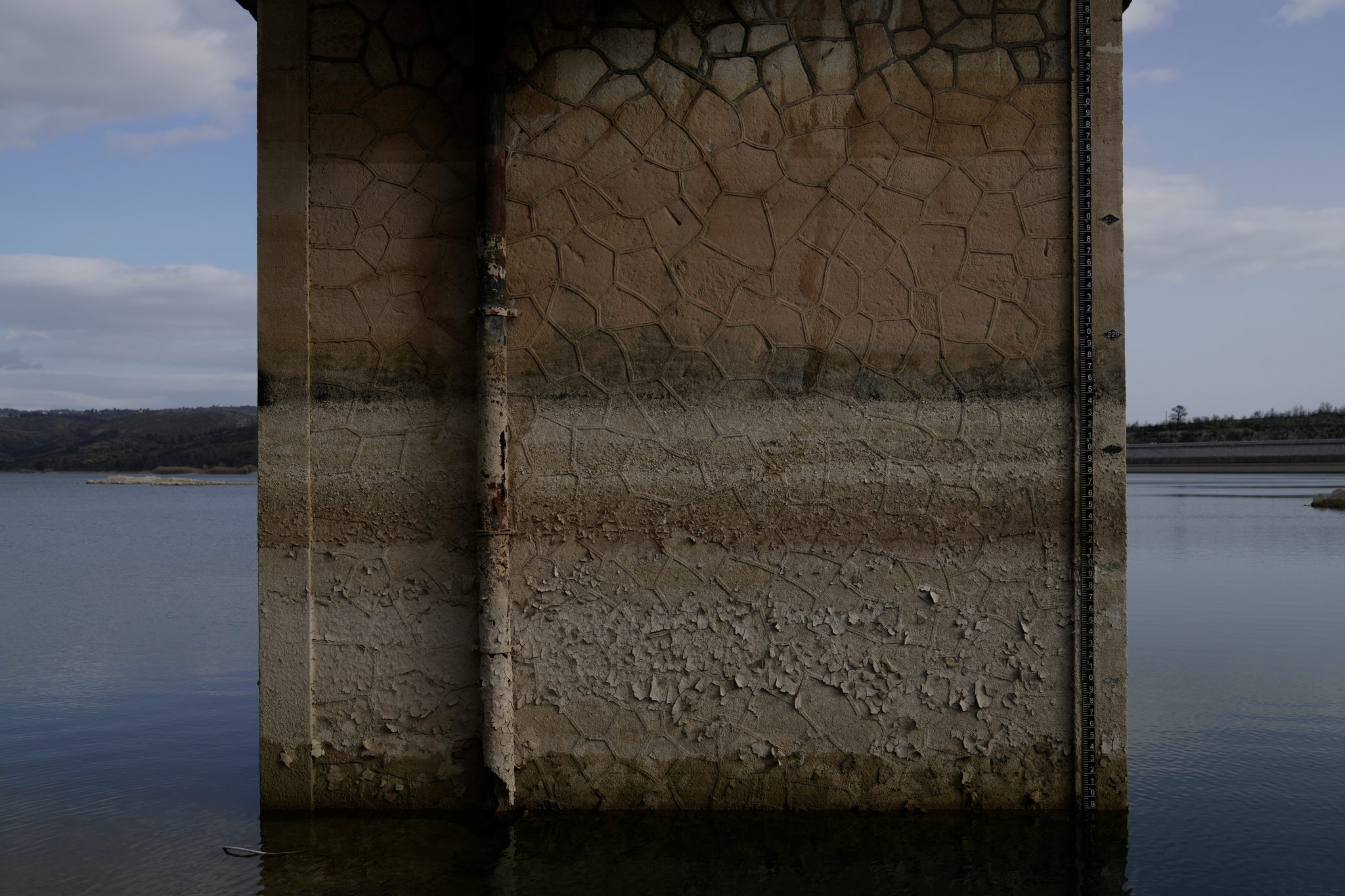 Η χαμηλή στάθμη της λίμνης Μαραθώνα φαίνεται στον πύργο υδροληψίας (AP Photo/Thanassis Stavrakis)