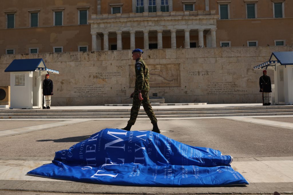 Κοινό αίτημα των συμμετεχόντων, η απόδοση δικαιοσύνης και η πλήρης διαλεύκανση των συνθηκών και αιτιών του σιδηροδρομικού δυστυχήματος. Με φόντο το Μνημείο του Αγνώστου Στρατιώτη μια νεαρή κοπέλα υψώνει την ελληνική σημαία.