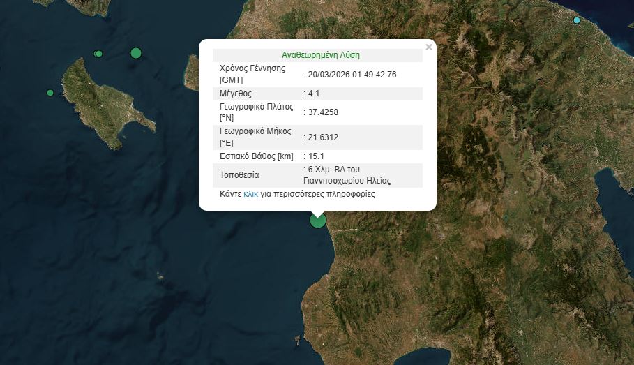 Σεισμική δόνηση μεγέθους 4,1 βαθμών της κλίμακας Ρίχτερ σημειώθηκε στις 03:49 τα ξημερώματα στην Ηλεία.
