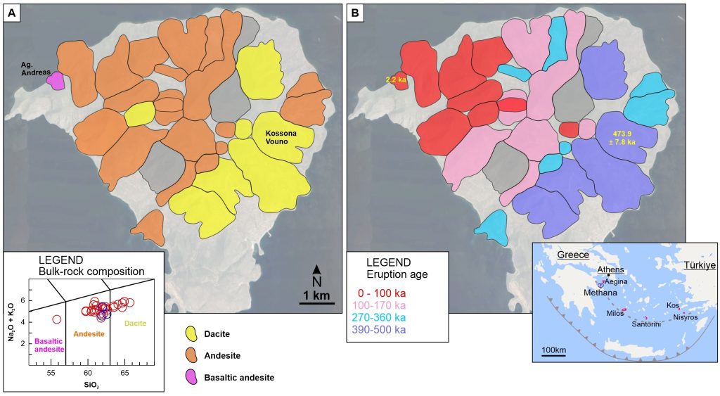 Επισκόπηση της σύστασης και της χρονολογίας των εκρήξεων του ηφαιστείου στα Μέθανα. Credit: Popa et al., 2026, Science Advances
